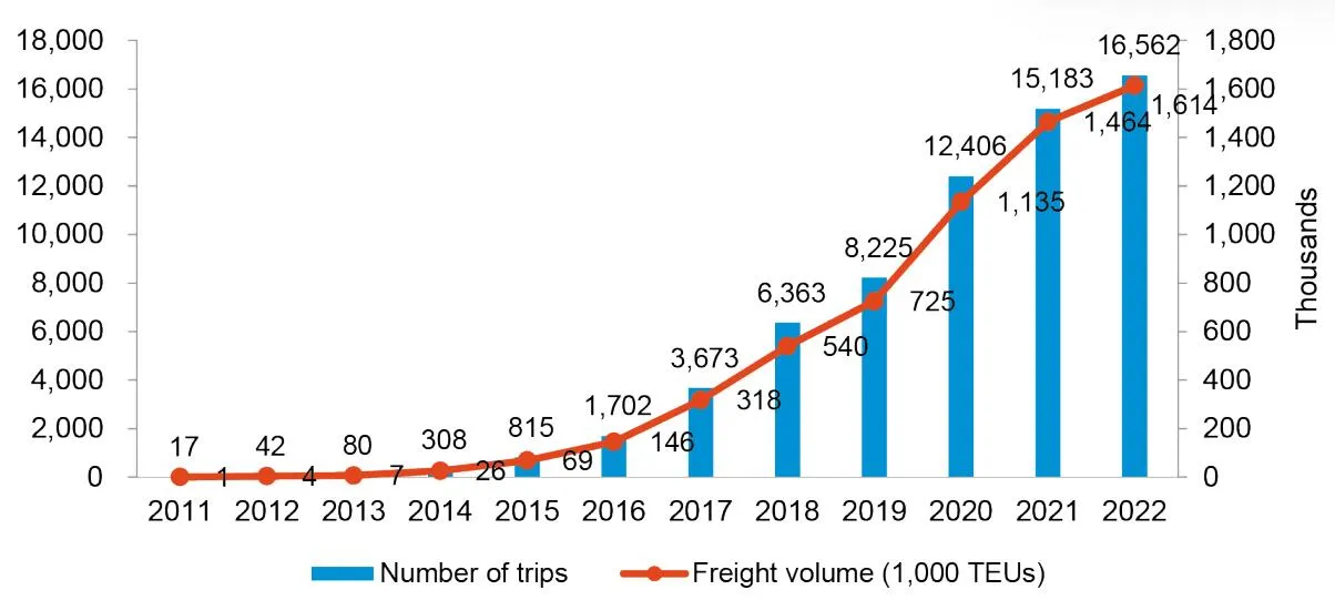 As part of its Belt and Road Initiative, China has spent many trillions of dollars (USD) to develop a modern road and rail infrastructure to ship goods not only within China, but into neighboring countries and regions. The freight service and ship times have been improving year by year.